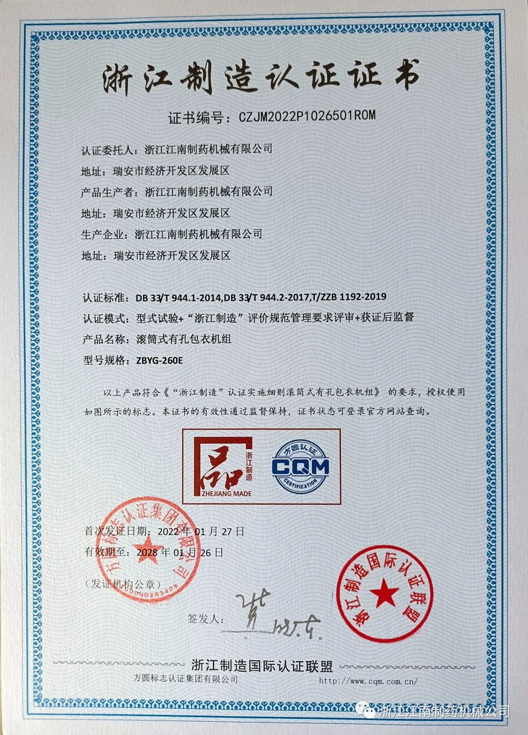 浙江江南制药机械有限公司收到了由浙江制造国际认证联盟颁发的“浙江制造”认证证书。