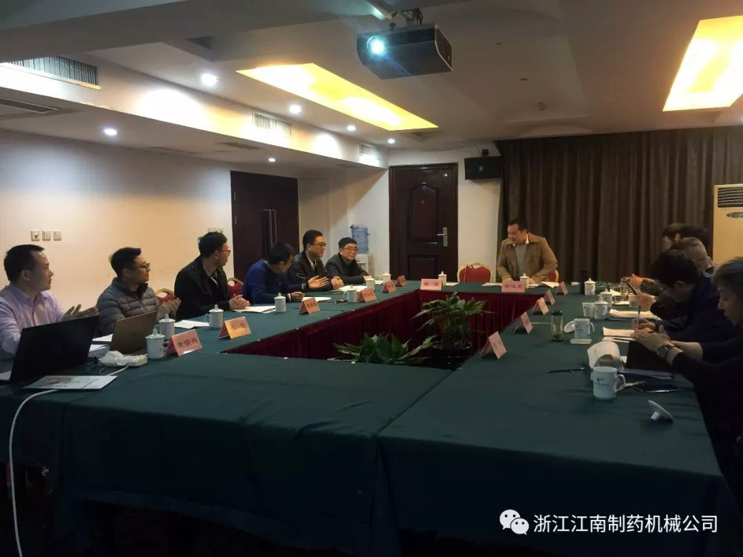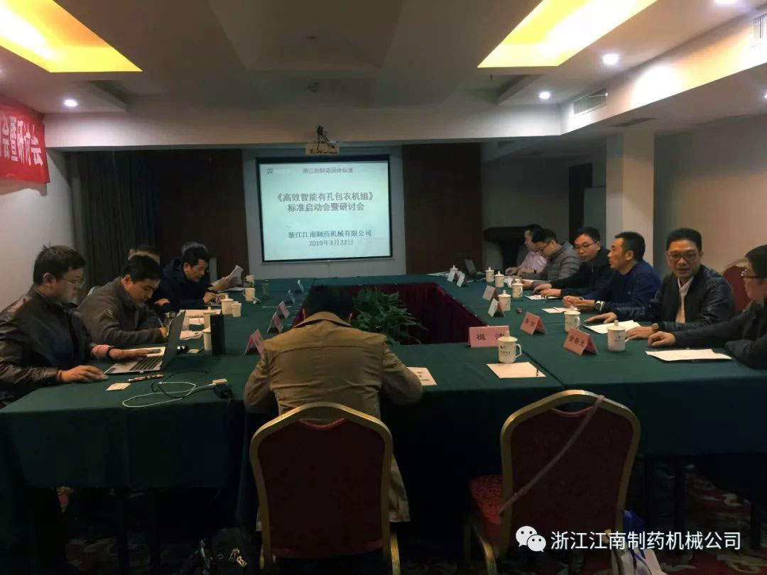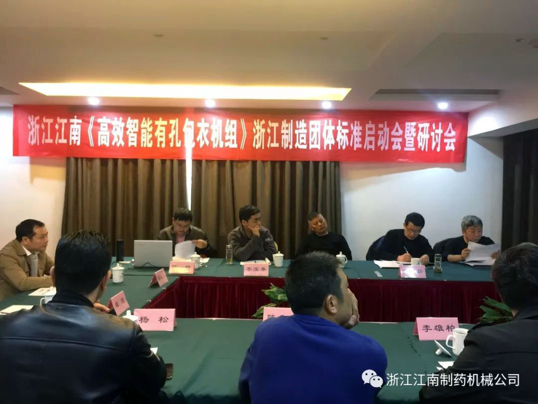 浙江江南制药机械有限公司《高效智能滚筒式有孔包衣机组》浙江制造团体标准启动会暨研讨会3月22日(星期五)下午13:30在瑞安华侨饭店召开,为了确保“浙江制造”标准的严谨,会议邀请了全国制药机械标准化技术委员会主任高工李宝秦、华东集团华润制药有限公司高工沈正良、温州市工业设计院教授级高工金建新、温州职业技术学院博士张洁、温州市标准化研究院高级工程师祖洁、瑞安市市场监督管理局高级工程师吴国华、浙江方圆检测集团高级工程师陈锋、瑞安机械行业协会秘书长金普光及我公司董事长杨松、工程师李雄柏、张富等多位专业工程师。工作组专家及成员针对标准草案进行细致而严格的研讨,探讨确定了标准的主要内容及框架,一致肯定了浙江江南制药机械有限公司《高效智能滚筒式有孔包衣机组》浙江制造标准的先进性、准确性。
